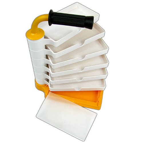 Looking to organize parts or tools into one easy to use container? Then look no further! This six wing tool holder with convenient carrying handle is just what you need. It contains six swiveling trays which are mounted on a solid plastic frame complete with carrying handle. The trays swivel allowing for easy access to whatever they may contain. Each tray measures 4.5 x 8 x .875 inches with an overall unit height of 13.5 inches tall. The bottom of the unit contains even more storage with compartment with sliding lid.